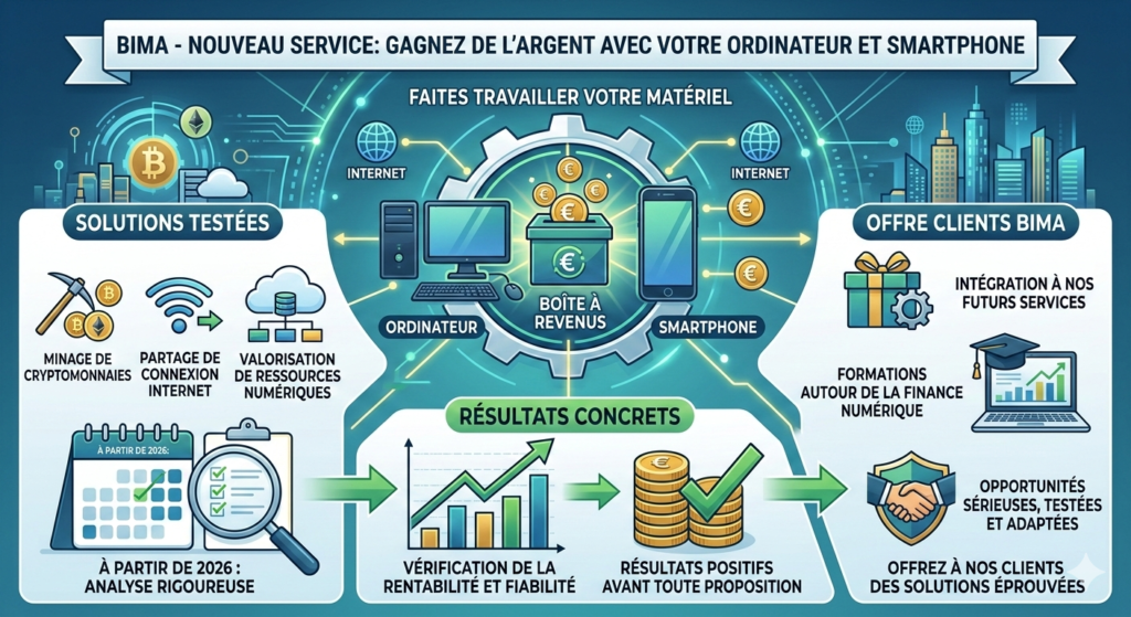 Gagner de l’argent grâce à son ordinateur ou à son smartphone sans effort fait rêver beaucoup de monde. Chez Bima, nous avons décidé d’explorer sérieusement cette opportunité en recherchant des solutions concrètes et accessibles pour faire travailler les appareils du quotidien. Notre objectif est d’identifier des méthodes simples qui permettent, dans certaines conditions, de générer des revenus complémentaires.